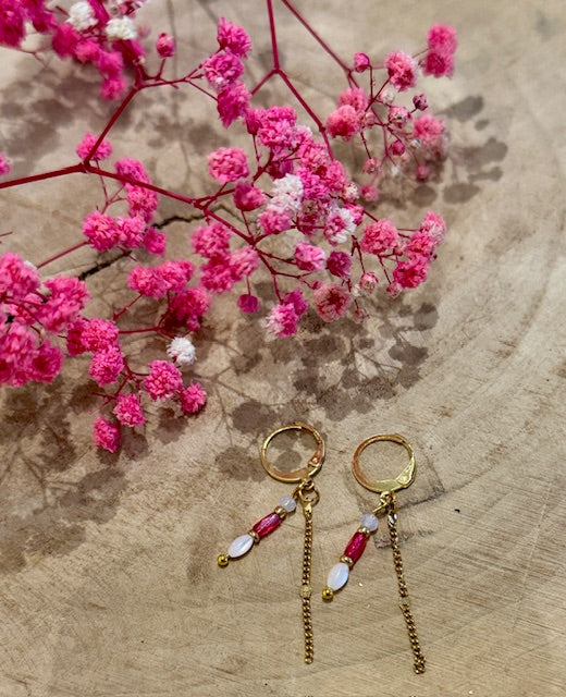 De combinatie van glanzend wit, zachtroze tinten en fijne gouden details zorgt voor een oorbel die vrouwelijkheid uitstraalt zonder te overheersen. De speelse gouden ketting voegt net dat beetje extra flair toe.