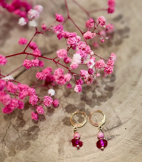De warme, fonkelende rode glaskralen vangen het licht bij elke beweging, terwijl de zachte roze steen een kalme balans biedt.